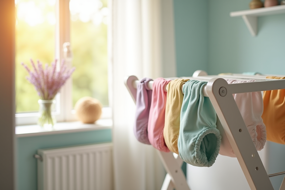 Le séchage des couches lavables s’avère déterminant pour préserver leur fraîcheur. Exposez les couches à l’air libre, l’action du vent et du soleil contribue à neutraliser les mauvaises odeurs et à désinfecter naturellement le tissu. Pour les appartements ou en cas de mauvais temps, privilégiez un séchage en intérieur bien ventilé. Évitez le séchage sur des radiateurs qui pourrait endommager les fibres et fixer les odeurs.